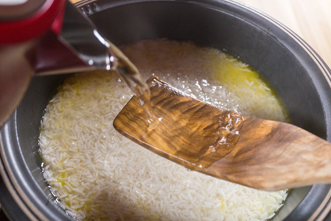 Поместить в кастрюлю рис. Перемешивая обжарить его 30-60 секунд. Масло должно обволакивать все рисинки.
