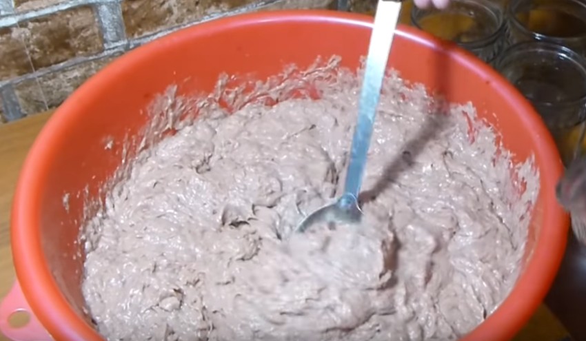 Когда содержимое сковороды остыло, берем мясорубку с самой мелкой решеткой и дважды прокручиваем. В блендере я пробовала, мне не нравится, после него иногда попадаются волокна. В готовую массу добавляем бульон из сковородки и мягкое сливочное масло, тщательно перемешиваем, утрамбовываем в миску, накрываем тарелочкой (пленкой) и ставим в холодильник остывать.