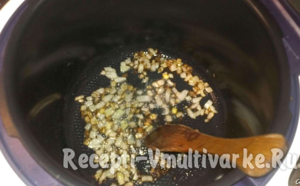 Отправляем лук жариться в мультиварке до золотистого цвета.