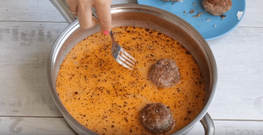 - Дальше поставьте на огонь сковороду, перелейте в нее соус, дождитесь закипания. После этого прикрутите конфорку до минимума и заложите в сковороду мясные колобки. Тушите их под закрытой крышкой 35-40 минут.