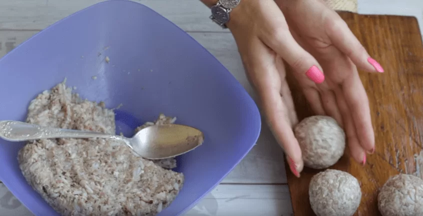 - Из рисово-мясной массы формируем колобочки по 5 см в диаметре.