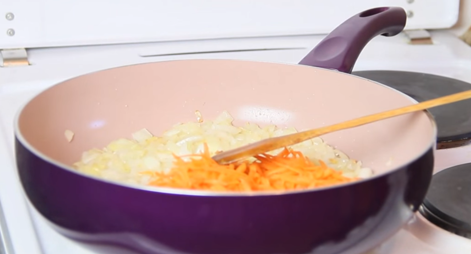 На разогретое масло высыпаем лук, жарим 2-3 минуты – до появления золотинки, помешиваем. Добавляем морковь.