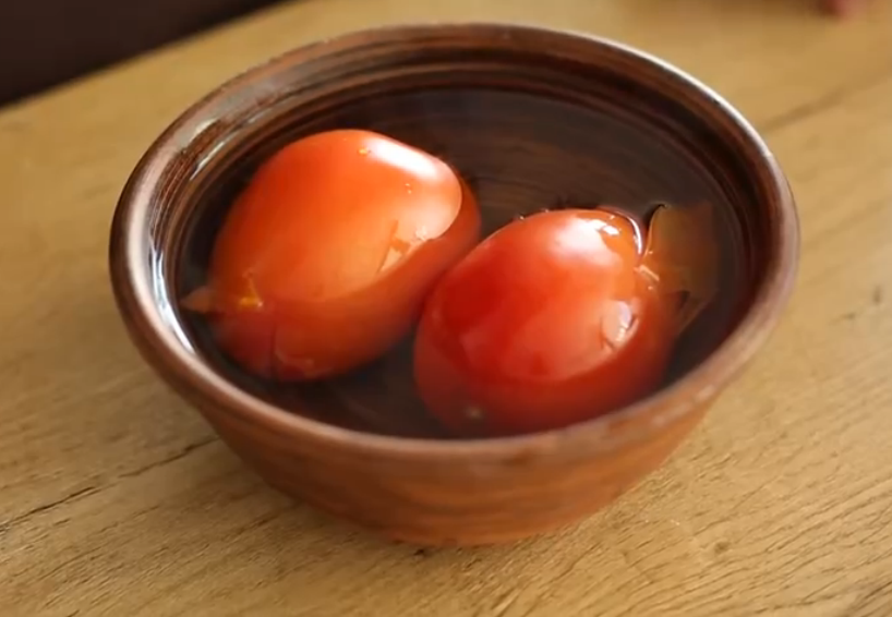 У помидоров сделаем крестообразный надрез, опускаем в кипяток на несколько минут, потом – в холодную воду. Теперь снять кожицу будет довольно легко.