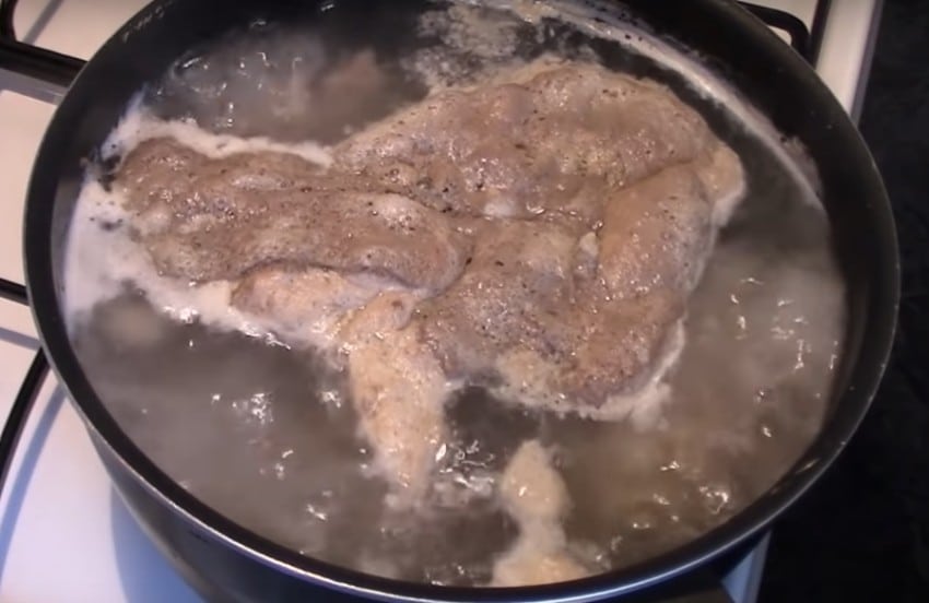 2. Чтобы избавиться от остатков запекшейся крови и размягчить шкурку рульки и ножек, мясопродукты нужно замочить в холодной воде на несколько часов. Обычно это делают на ночь. Куриное мясо и мясо индейки замачивать не нужно. Утром шкурку очищают от темных пятен, оставшихся после процедуры осмаливания, а все мясо хорошо промывают. Теперь его можно ставить варить.