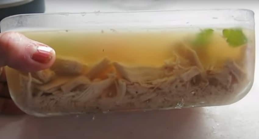 - Залить наваристым бульон, отправить застывать на холод, примерно на 6-8 часов.