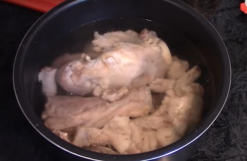 - Вытащить все ингредиенты из бульона. Когда мясо немного остынет, его нужно порезать небольшими кусочками. Лапки тоже можно использовать, тщательно удалив косточки;