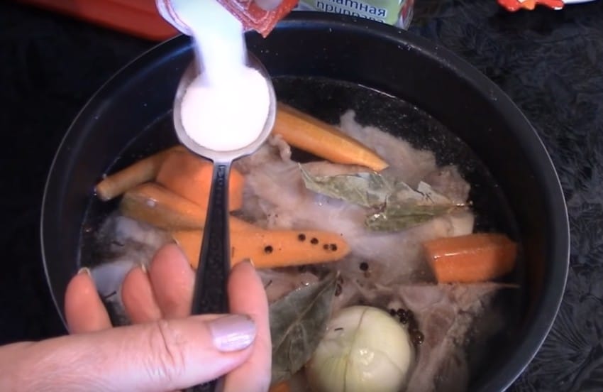 После 6 -7 часов варки, под едва приоткрытой крышкой, когда косточки легко отходят от мяса, луковицу и лавровые листочки можно выбросить, а морковь вытащить. Попробовать бульон на соль и если нужно досолить. Вкус должен быть хорошо соленым. Добавить давленый чеснок и через минуту выключить огонь.