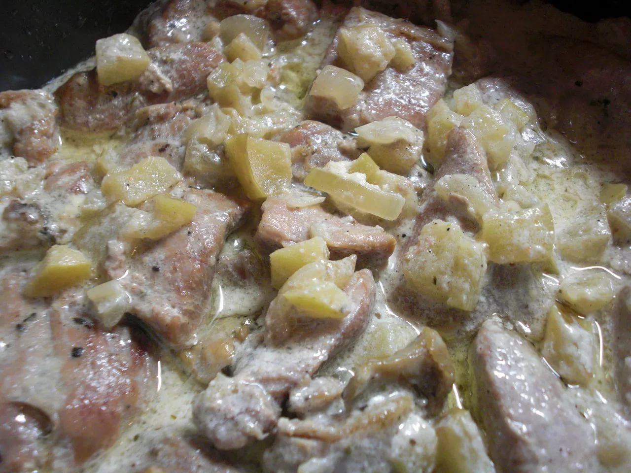 Перекладываем зажарку в кастрюлю. Проверяем готовность клубней картошки, которую мы с самого начала отправили вместе с индюшачьими шеями. Если картошка уже готова — то переходим к следующему этапу.
