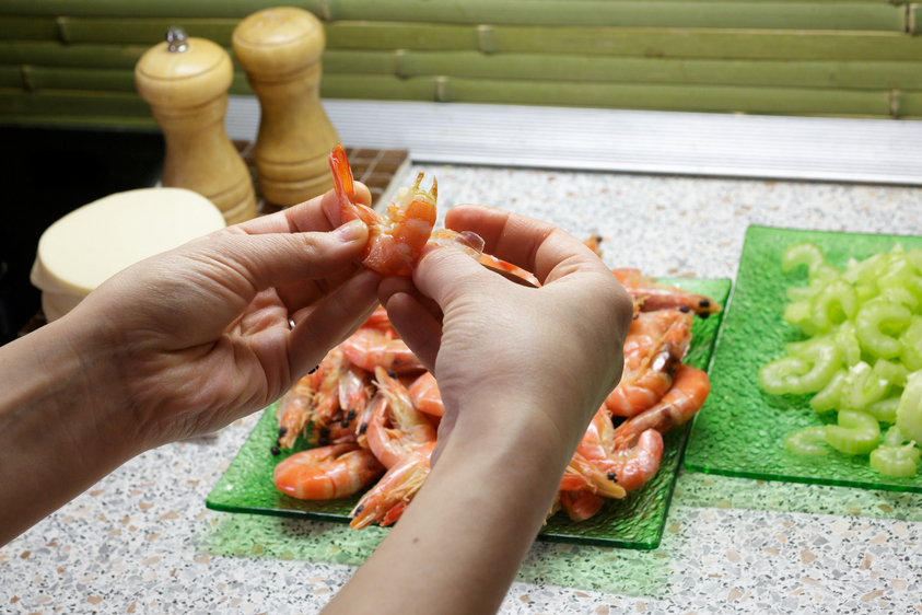 Если креветки неочищенные – то их следует почистить, сняв панцирь и удалив голову. Хвостики у них должны остаться.