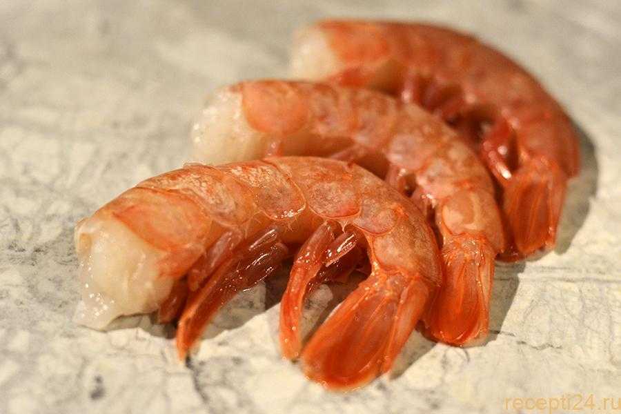 - Очищенные полуфабрикаты и сваренные перед заморозкой королевские креветки принято варить 1 минуту.