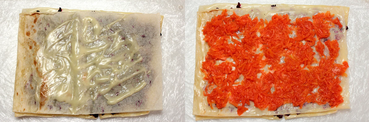 Сверху кладем следующий лист лаваша, который тоже предварительно смазали майонезом. Морковь, подготовленную таким же способом, как и свеклу, равномерно распределяем по всему листу лаваша (краешки стараемся закрыть начинкой).