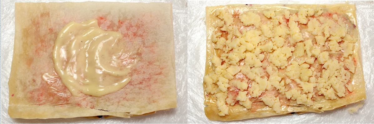 Укладываем третий лист лаваша, тоже промазанный майонезом. Распределяем картофельное пюре и прижимаем либо ложкой, либо ладонью, стараясь сделать так, чтобы картошка лежала ровным и не очень толстым слоем. Пюре нужно сделать достаточно крутым, чтобы лаваш не размок.