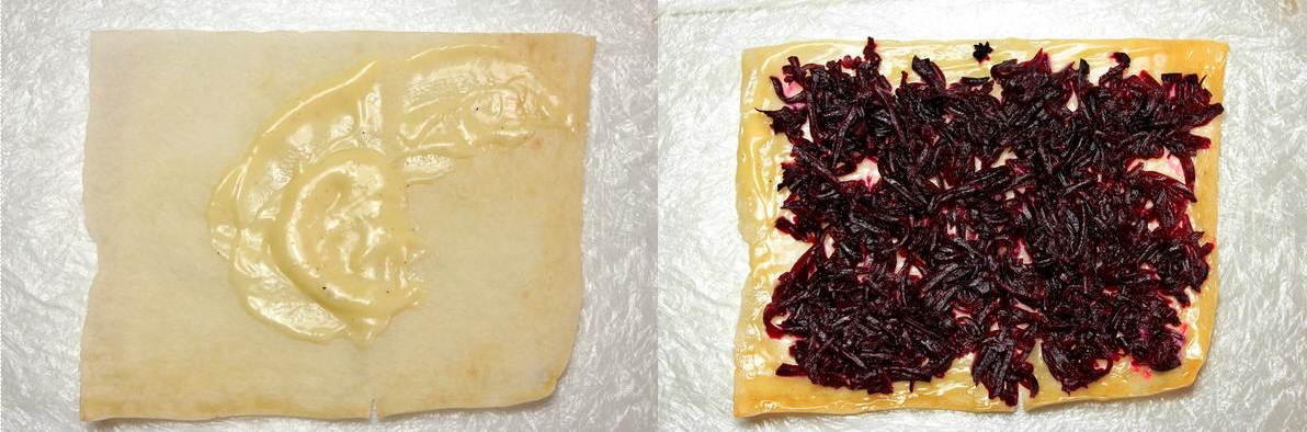 - Далее берем разделочную доску, обматываем пищевой пленкой, заворачивая края под доску, чтобы она не ездила. Затем натираем крупно свеклу и равномерно разравниваем по всех поверхности.