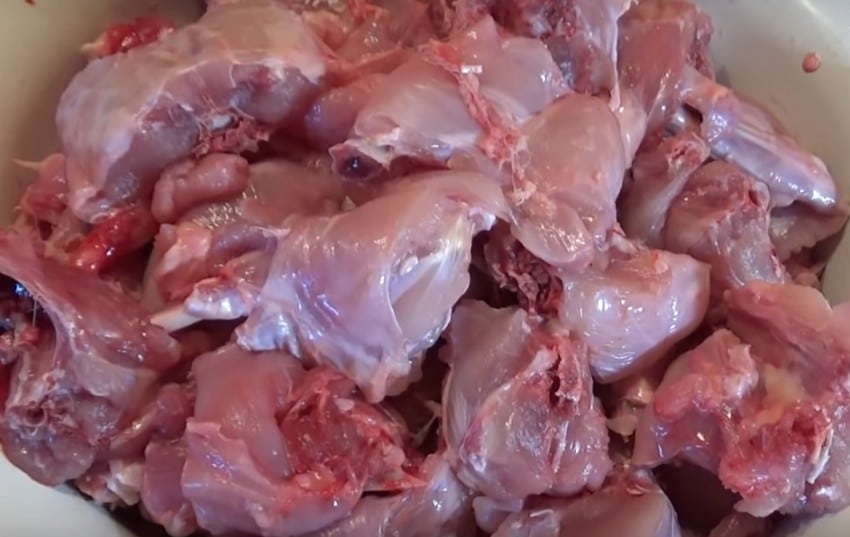 1. Вымоченного кролика разрежьте на небольшие кусочки вместе с костями.