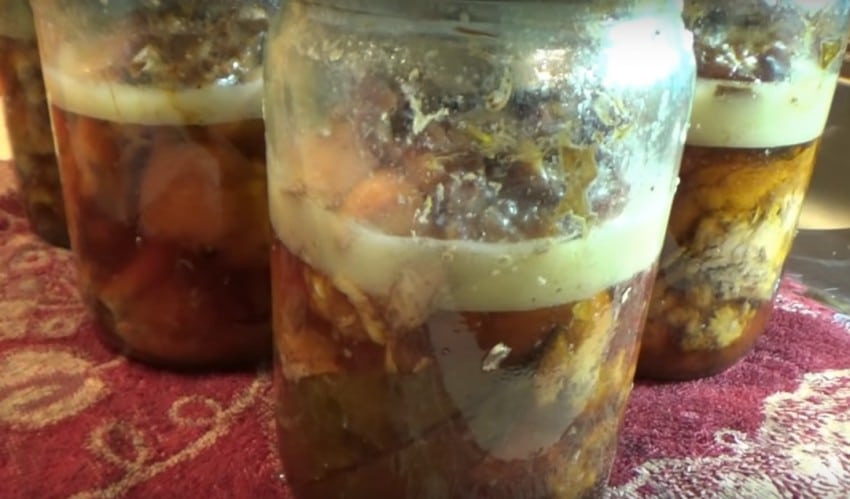 - За 20 минут до конца аккуратно достаньте банки, полейте мякоть предварительно растопленным свиным салом.
