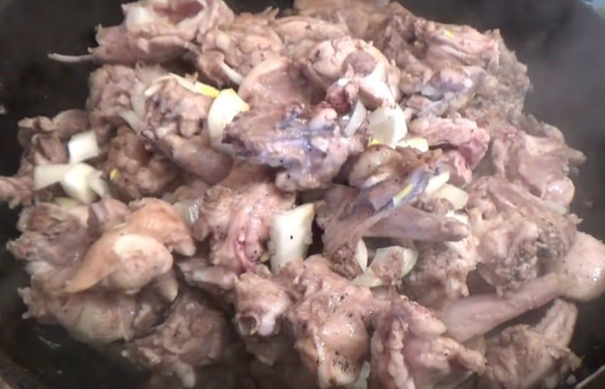 3. Репчатый лук порубите и отправьте в казан к кролику. Продолжайте обжаривание до мягкости лука под закрытой крышкой. Не забывайте периодически помешивать ингредиенты.