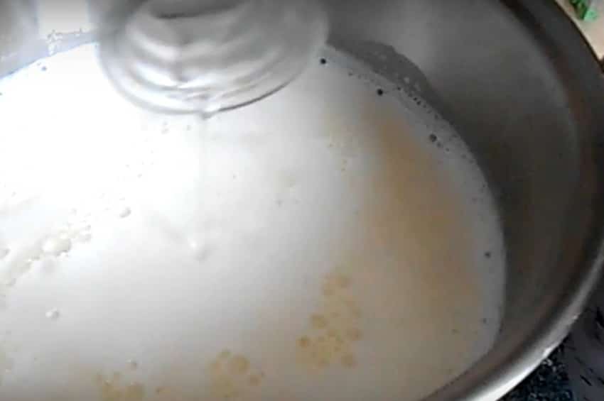 - В процессе нагревания молоко начнет сворачиваться, а твердые компоненты станут отделяться от сыворотки.