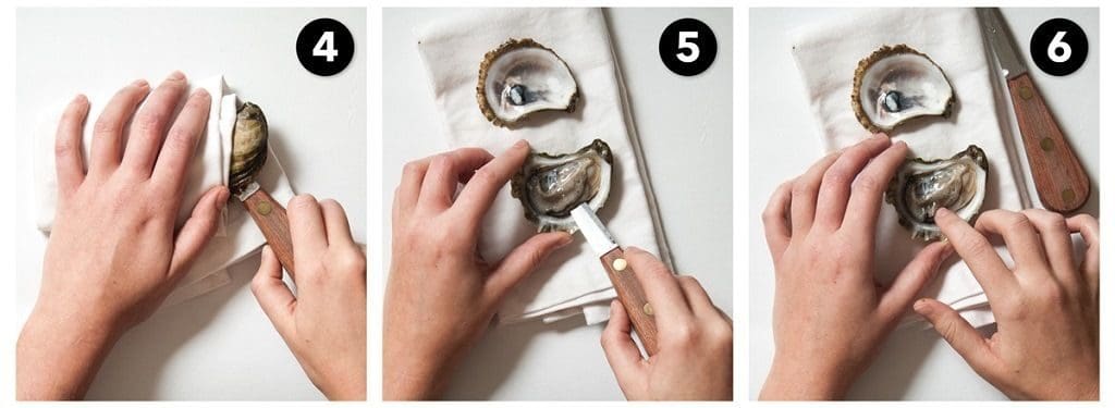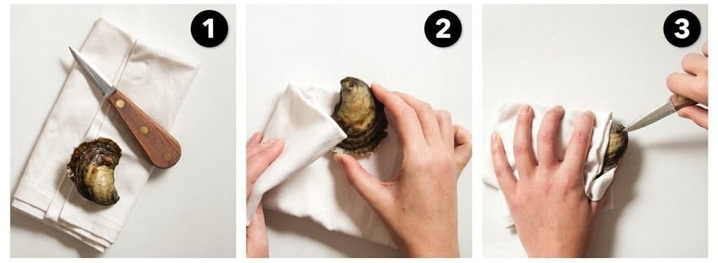 Раковину приоткрывают специальным ножом, вставляя лезвие в место соединения створок и аккуратно проворачивая рычаг. Живой моллюск непременно отреагирует, стараясь захлопнуть раковину. Задача сводится к тому, чтобы лезвием подрезать мышцу, соединяющую створки. Результатом стараний станет проступивший сквозь створки прозрачный сок.