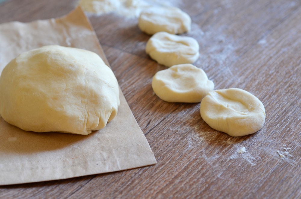 Соединяем воду с майонезом, перемешиваем. Постепенно в смесь насыпаем муку и перемешиваем с помощью ложечки, а затем руками. Вымешиваем тесто на столе – заранее присыпьте его слегка мукой (если потребуется – добавляйте в процессе больше муки). Даем ему отдохнуть 15 минут, накрыв пищевой пленкой.
