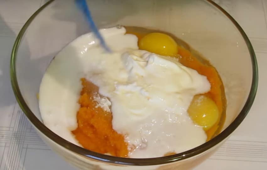 - В глубокой стеклянной миске смешиваются все ингредиенты. К пюре добавляем манку и хорошо промешиваем так, чтобы не получилось комочков. А затем постепенно добавляем яйца, соль, кефир, сахар. Каждое составляющее вводится отдельно, после каждого необходимо промешивать. В результате тесто должно быть похоже на очень густую сметану, иначе, для густоты добавьте манки, а для более жидкого состояния – кефир.