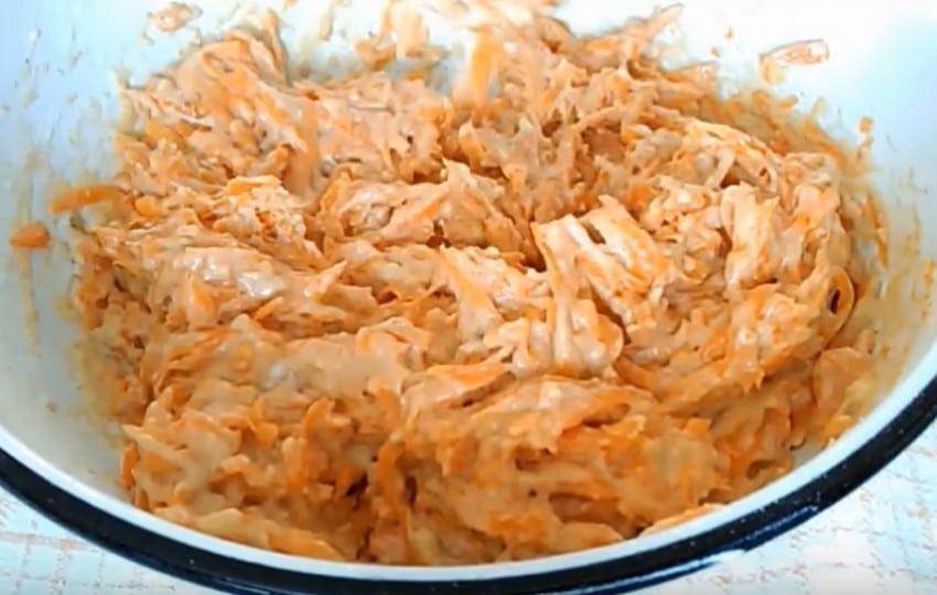 Тесто получается не очень густое, и за счет натертых овощей — не совсем однородное. Поэтому перед каждым выкладыванием оладушек на сковородку, тесто необходимо перемешивать.