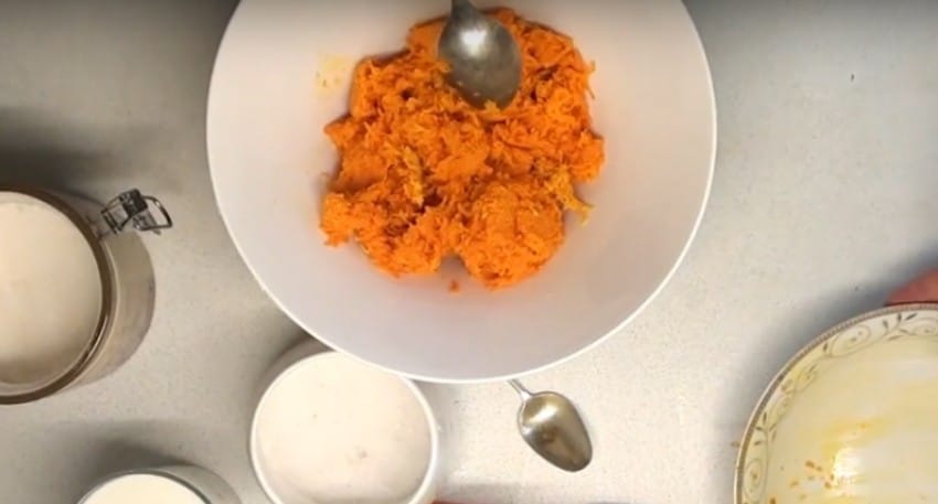 В данном случае нам нужно будет поработать немного больше, а вот у плиты стоять совсем не придется – всю работу сделает духовка. Рецепт оладьев из тыквы состоит из таких этапов: