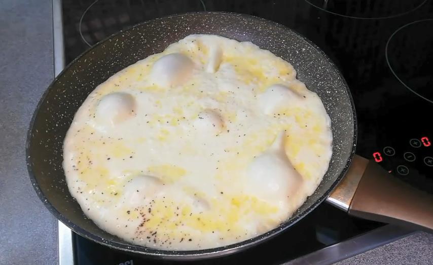 Нагреть сковородку и растопить на нем сливочное масло. В течение 7-8 минут прогреть под накрытой крышкой до поднятия яичной массы.