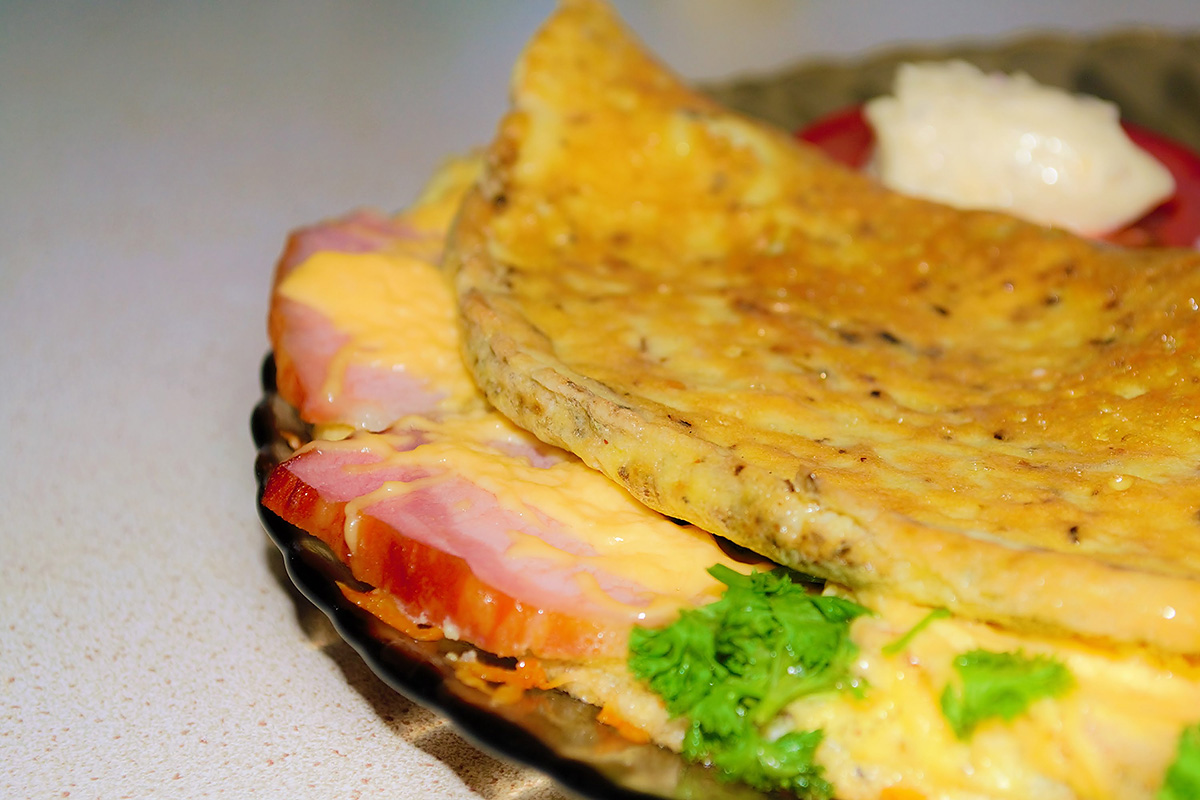 Омлетный блин остается на горячей сковороде при перекрытом огне, а на одну его половину выкладывается начинка: 1 слой — тертый сыр; 2 слой — томат резаный; 3 слой — ветчина резаная; 4 слой — тертый сыр.