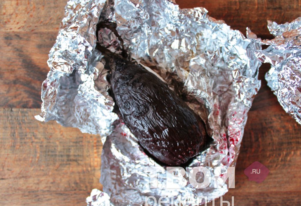 Разогреть духовку до 180 градусов. Свеклу хорошо вымыть от грязи или песка, завернуть в фольгу и отправить в разогретую духовку примерно на 1-1,5 часа.