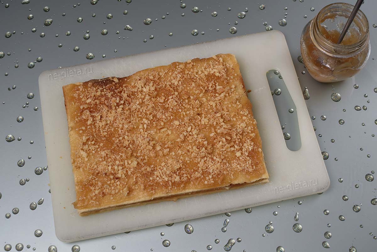 Тесто аккуратно намотать на скалку и перенести на противень, застеленный пергаментом. Выпекать в разогретой до 240°С духовке 8 – 10 минут до легкого зарумянивания. Вынуть тесто из духовки, слегка остудить и разрезать поперек на два одинаковых коржа. Один из коржей обильно смазать яблочным повидлом, немного не доходя до краев.