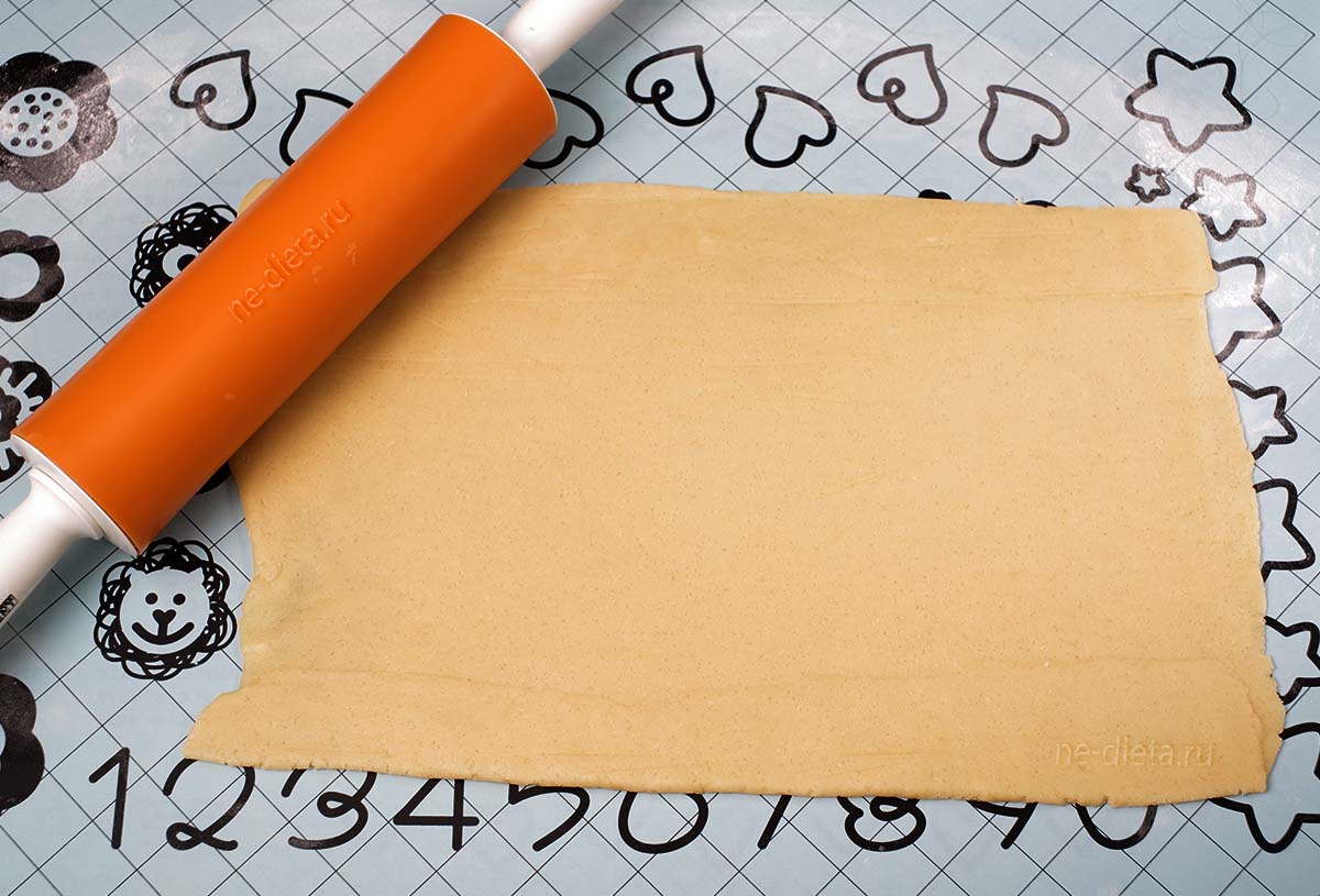 Заготовкой для будущих песочных полосок станет песочное тесто, раскатанное в квадрат или прямоугольник. При раскатке мне мука не понадобилась, а вы можете слегка подпылить тесто, если будет прилипать к скалке. Раскатывать тесто нужно до толщины около 1 сантиметра, если любите толстые полоски. Если по душе тонкий вариант выпечки, раскатывайте толщиной около 5 миллиметров. Подравнять края заготовки можно с помощью обычной линейки, а подлатать дырки — кусочками самого же теста. Чтобы тесто не деформировалось или не порвалось, советую раскатывать его сразу на пергаментной бумаге или тефлоновом коврике.