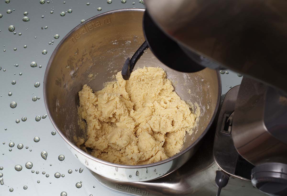 Замесить песочное тесто руками или с помощью насадки «крюк». Оно должно получиться довольно мягким и нелипким.