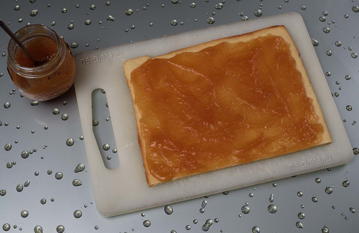 Одну часть коржа густо смажьте 200 граммами яблочного повидла.