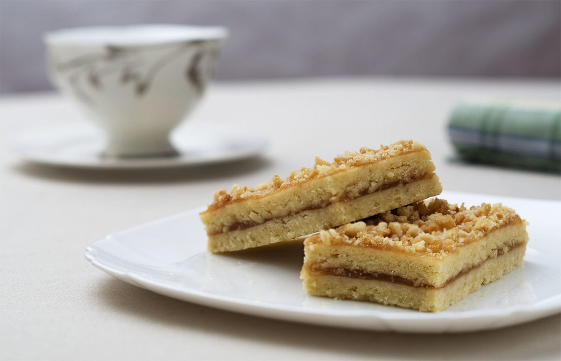 Необходимо дать пирожному полежать несколько часов при комнатной температуре, чтобы оно стало мягким и как следует пропиталось, после чего его можно разрезать на порционные прямоугольнички. Нежнейшие рассыпчатые песочные полоски с повидлом готовы!