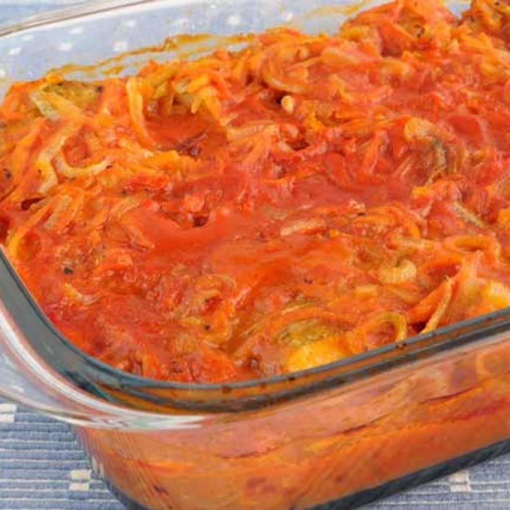 - На смесь из овощей положить кусочки пикши и полить домашним томатным соком.