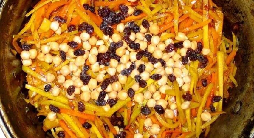 Говядина — 500 г; Рис — 0.5 стак. (200 мл); Морковь — 2 шт.; Лук репчатый — 1 шт.; Чеснок — 4 зубч; Изюм…