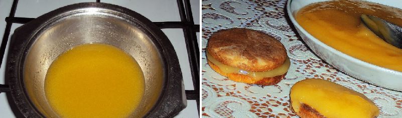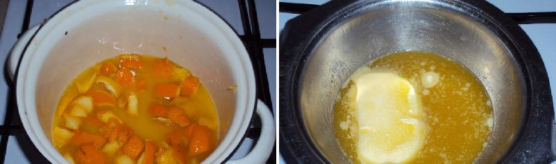 Насыщенный цитрусовый отвар процеживаем в металлическую ёмкость, добавляем сливочное масло и сахар. Далее нагреваем до тех пор, пока не растворятся и масло и сахар. Доводим до кипения и снимаем с огня.
