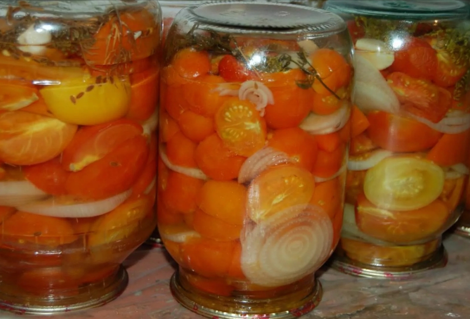 В банку складывают лук, нарезанный полукольцами, колечки перца, специи. Помидоры разрезают не до конца, в разрез кладут пластинку чеснока, веточку укропа. После укладывают в банки. Заливают дважды маринадом, приготовленным из оставшихся ингредиентов. Завинчивают. Остужают под одеялом.