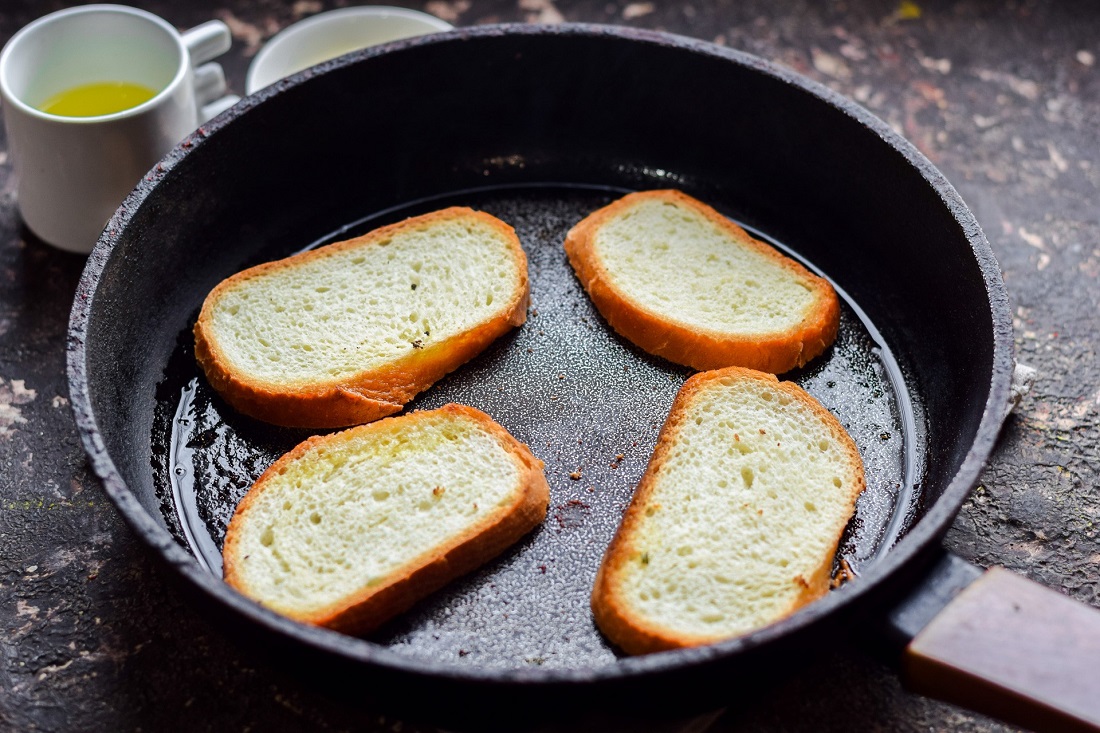 - Поджарить канапе-батончики на сухой сковороде до золотистости или поджарьте тостовый хлеб в тостере.