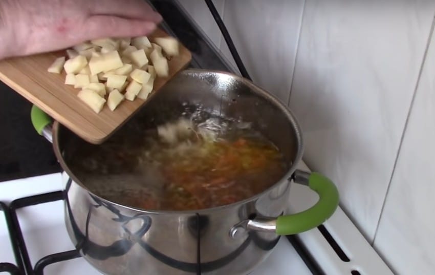 3. Вылейте в кастрюлю холодную воду и доведите до кипения. В полученный кипящий грибной бульон с овощами отправьте картофель. Варите 5 минут.