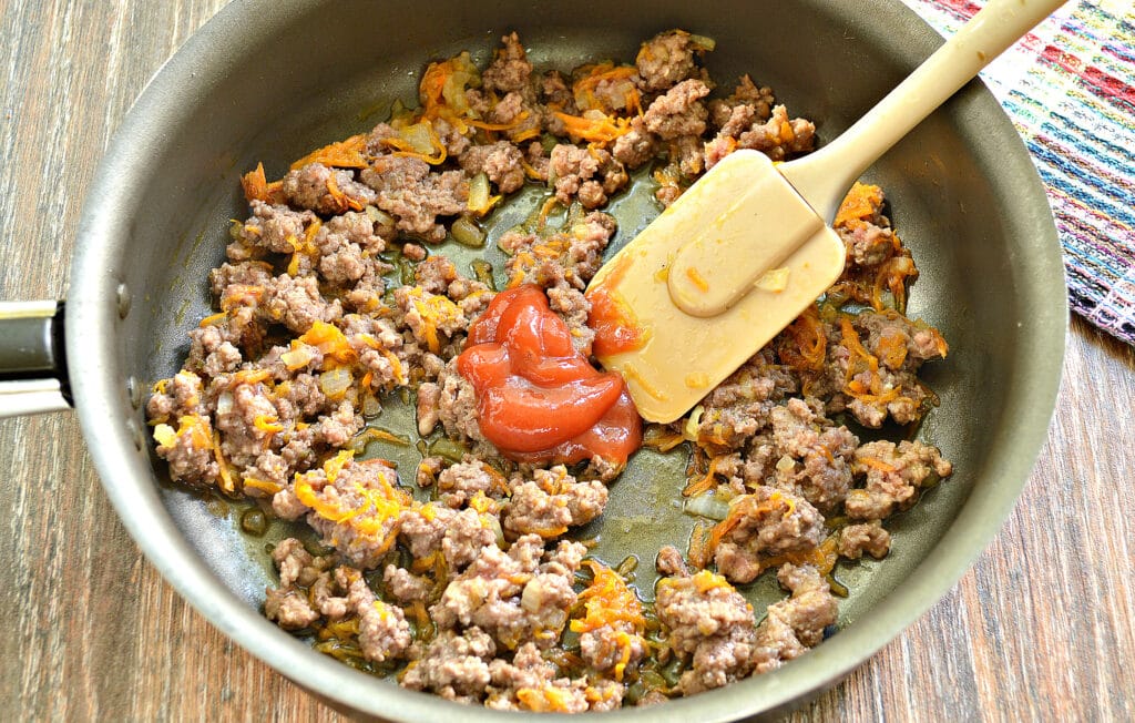 Затем добавить по вкусу томатный соус и хорошо его размешать. Можно вместо него использовать томатную пасту, тогда ее брать не более 2 ст. ложек. А в сезон созревания томатов лучше всего приготовить соус из них.