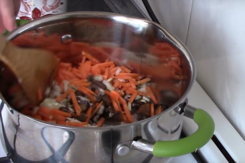 2. На дно кастрюли налейте растительное масло. Высыпьте грибы и обжарьте: вареные — пару минут, сырые – практически до готовности. Добавьте лук с морковью и продолжайте готовить до мягкости.