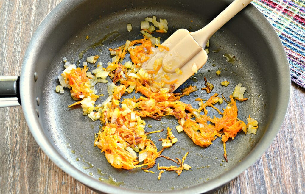 Перемешиваем и на медленном огне обжариваем до золотистого цвета наш лучок.