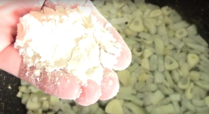 Чтобы сделать сметанный соус более пикантным, добавим пропущенные через пресс зубчики чеснока. Доведем соус до вкуса, посолим и приправим его черным молотым перцем.