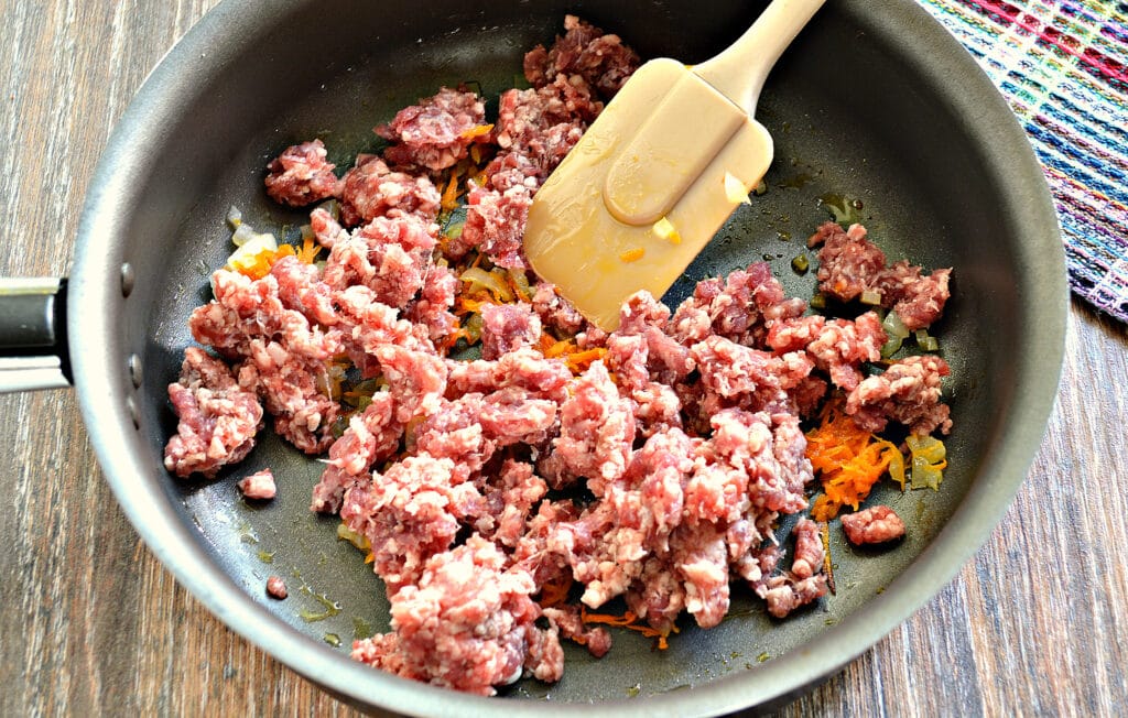 - Фарш следует пожарить на сковороде в масле (нам пока понадобится только половина масла, указанного в списке продуктов). Время жарки — приблизительно 10 минут. Часто помешиваем и разбиваем все комочки.