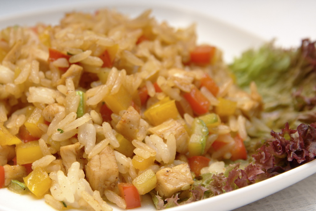 Приготовить рис можно и просто с овощами, а если добавить курятину, то получится полноценный обед или ужин.
