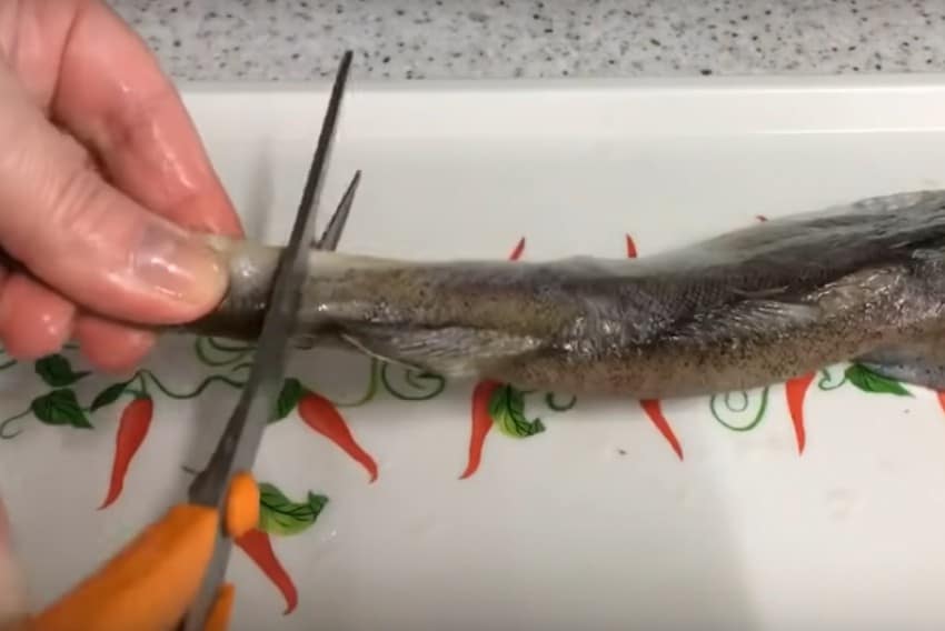 Удаляем голову, хвост, плавники, чешую чистить не нужно.