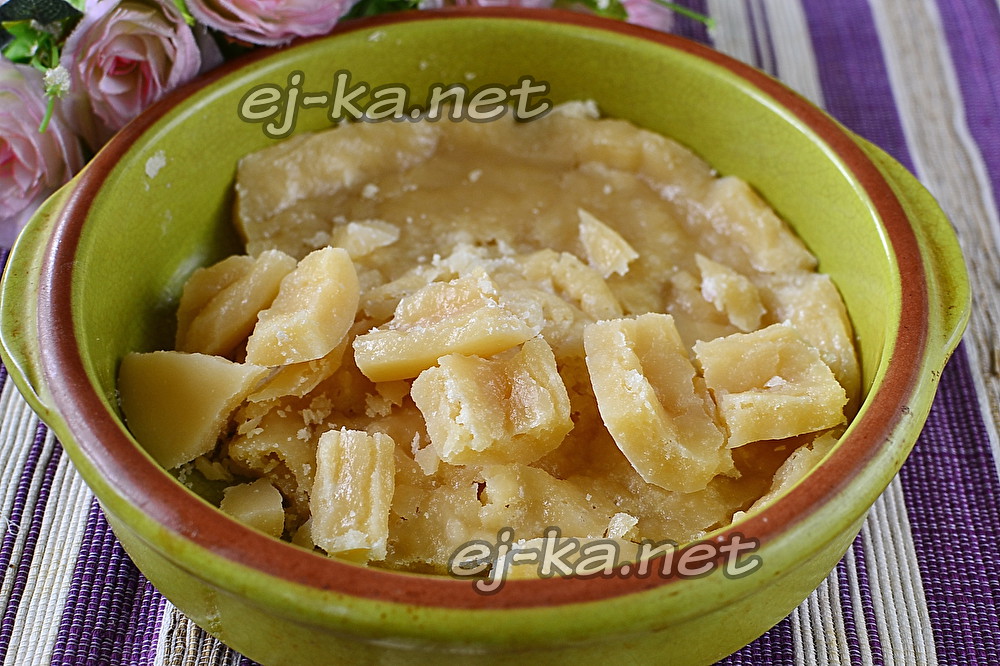 - После этого полученную смесь вылейте в отдельную миску, предварительно смазанную сливочным маслом. Рецепт предлагает оставить массу на некоторое время, чтобы она смогла как следует остудиться.