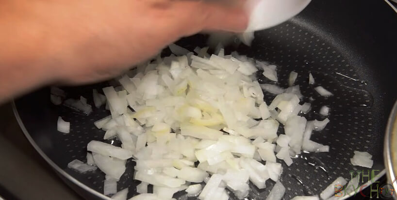 9.Прогреваем сковородочку с растительным маслом. Кидаем обжариваться лук до прозрачного состояния.