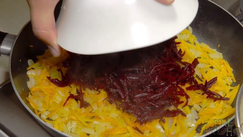 11.Конечный этап — свекла. Все овощи тщательно смешиваем и жарим, тушим до готовности.